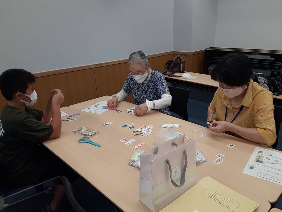 今回、初の試みとして地域福祉サポーターに協力をしてもらい、地域の皆様から集まった古切手の切り分け作業を所沢市こどもと福祉の未来館にて行いました。